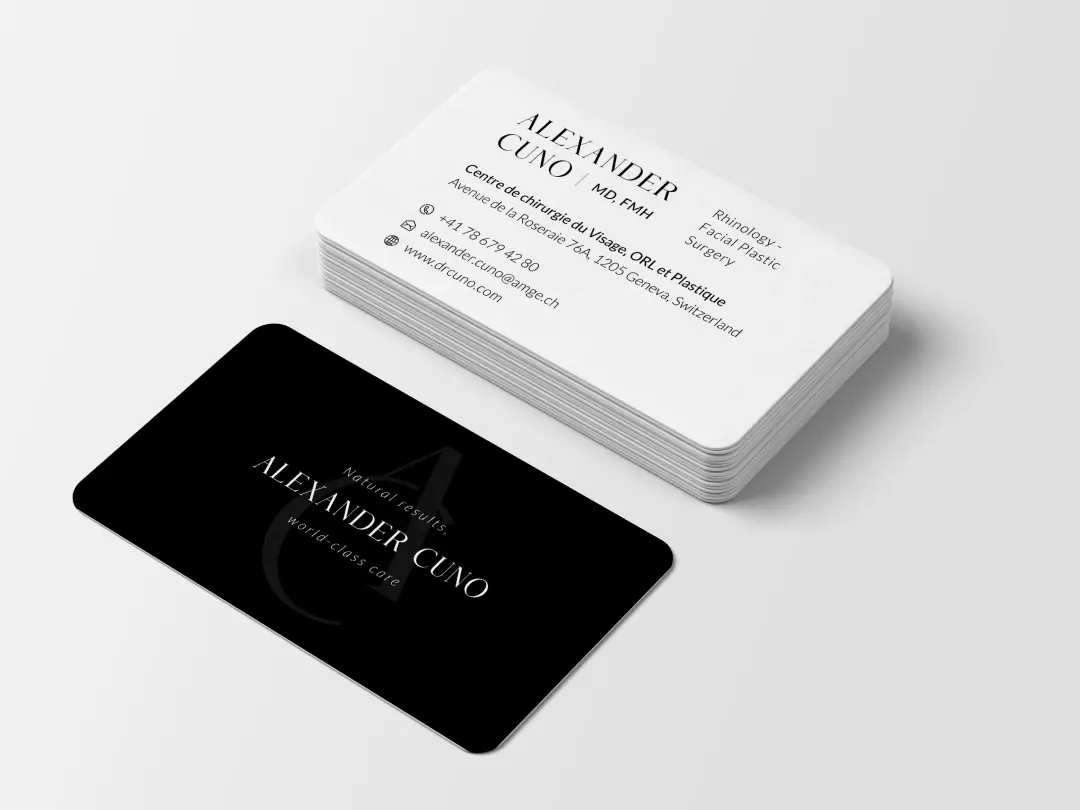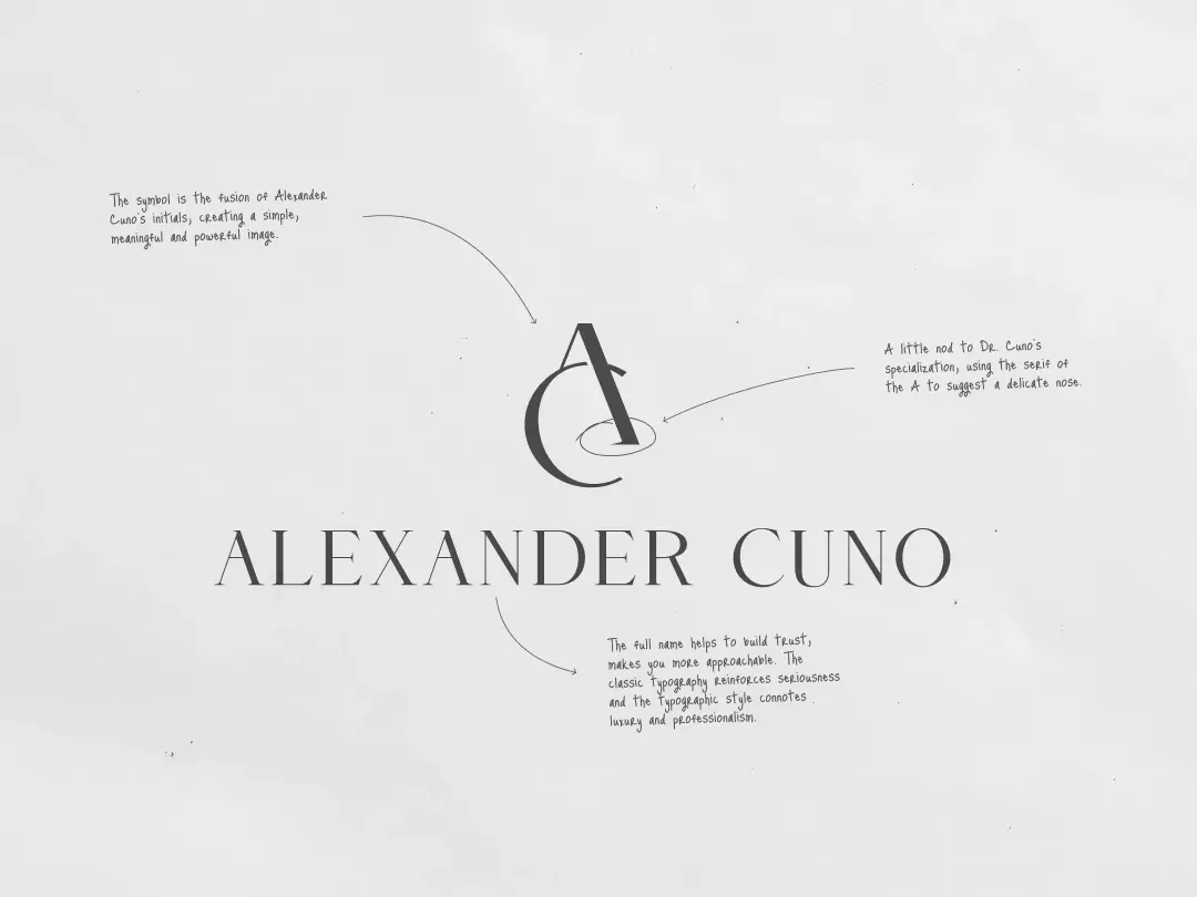 L’image de marque d’Alexander Cuno transmet l’élégance, la confiance et l’exclusivité grâce à un monogramme « AC » minimaliste et à une typographie sophistiquée, renforcés par une palette sobre de noir, de blanc et de métallisé. La cohérence visuelle sur tous les supports (cartes, web, badges) assure la reconnaissance et projette une image médicale prestigieuse.