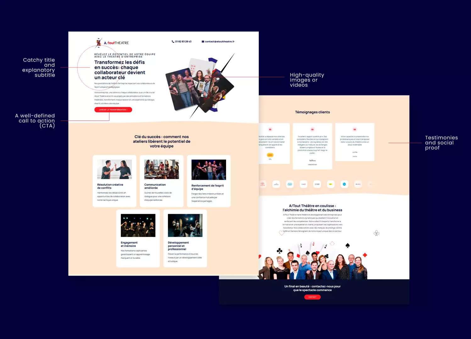 Le principal défi pour A/tout Théâtre était de concevoir une landing page efficace qui résonne avec leurs services théâtraux uniques. Grâce à des optimisations mensuelles continues, nous avons considérablement amélioré son efficacité, ce qui a conduit à une augmentation notable des conversions.
