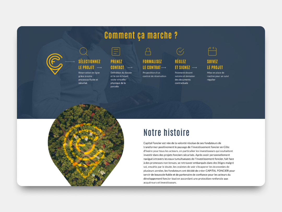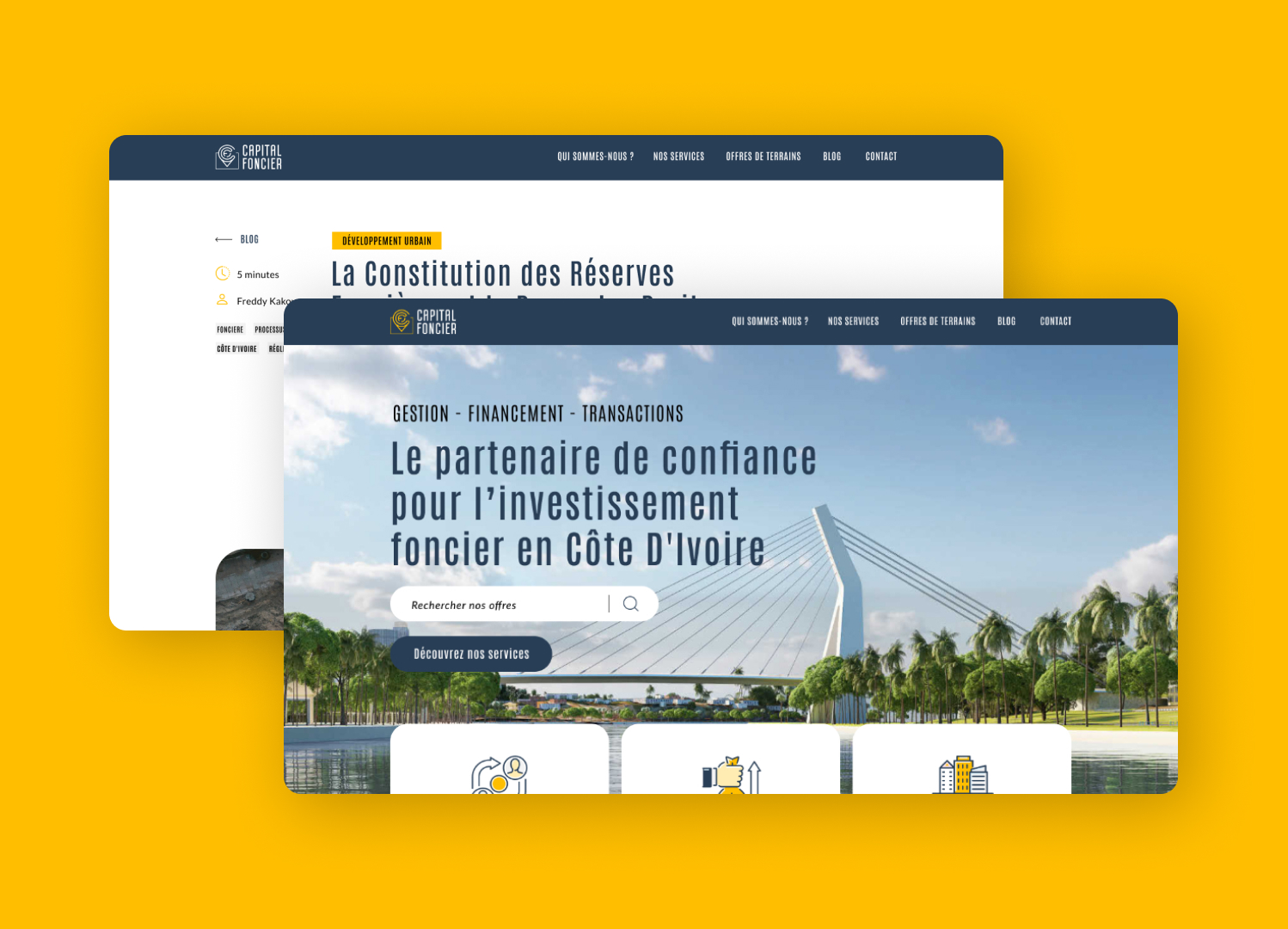 Capital Foncier, basé en Côte d'Ivoire, est spécialisé dans le financement, la structuration et la gestion de projets fonciers. O objetivo foi desenvolver um site moderno, fácil de usar, que reflita seus valores e mostre sua expertise.