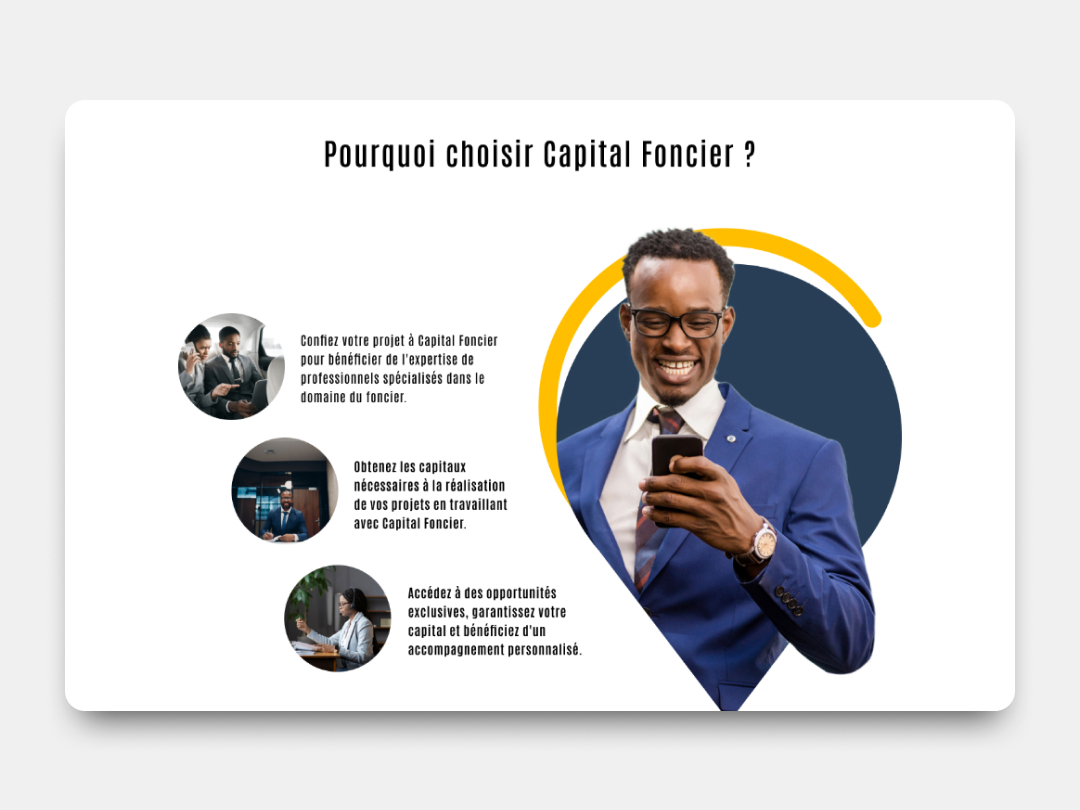 Le site internet est prêt à améliorer considérablement l'activité de l'équipe Capital Foncier. Il est conçu pour augmenter la notoriété, la visibilité en ligne, générer plus de leads, augmenter les ventes et renforcer les relations avec les clients. L'entreprise est désormais bien équipée pour se développer sur le marché foncier en Côte d'Ivoire.