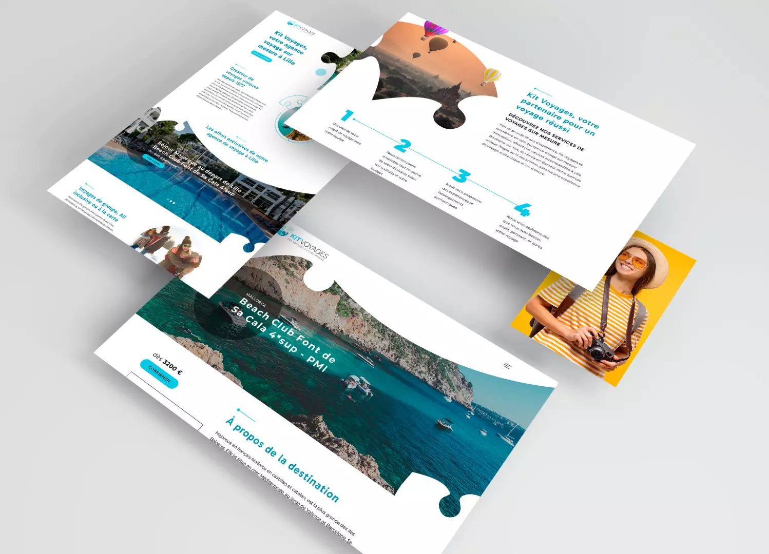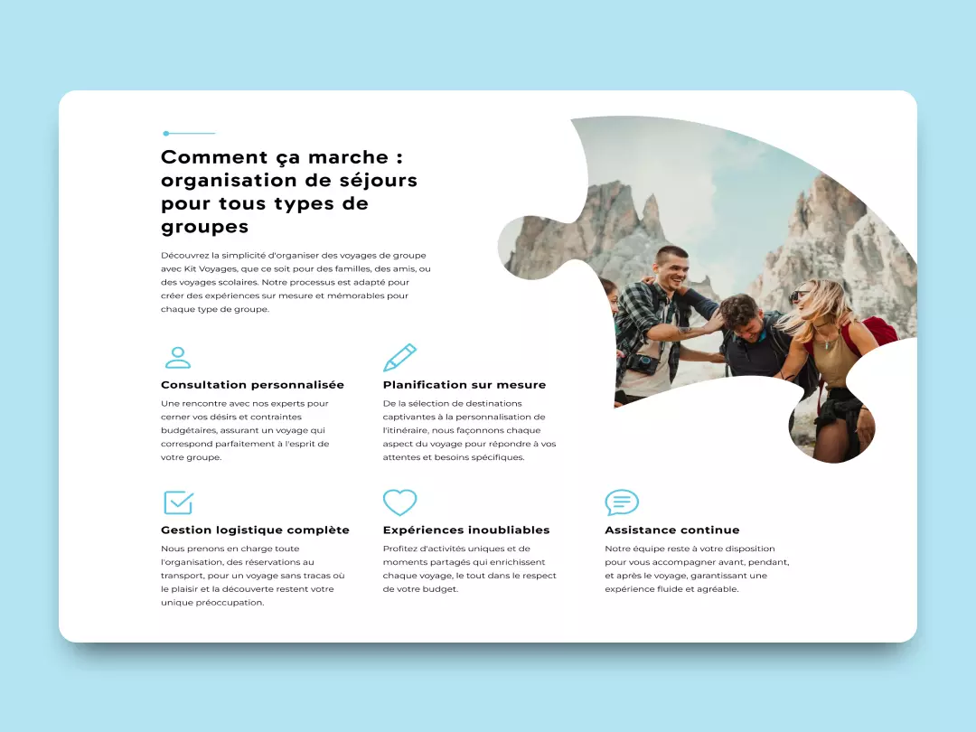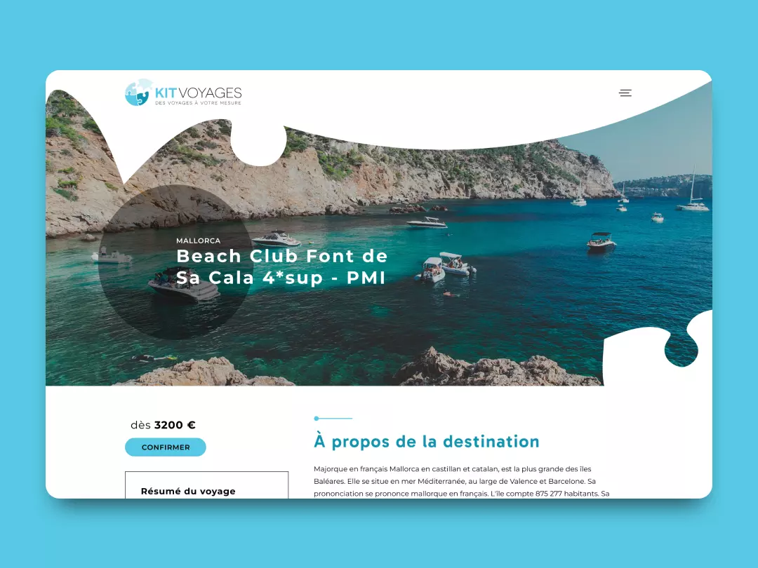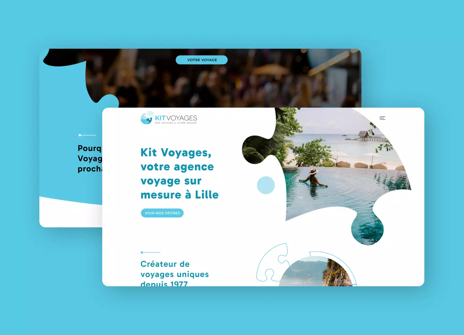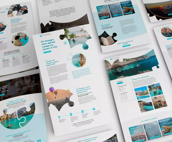 Dès la simplification du logo, la direction à prendre était claire : un site web simple, mais visuellement puissant. Un site fonctionnel qui serait un voyage pour l'utilisateur à travers chaque élément, tous conçus pour être une expérience unique, comme les voyages de Kit Voyages. En nous concentrant sur les pièces du puzzle qui composent le logo, nous avons travaillé sur chaque image et chaque forme pour obtenir du mouvement, du dynamisme et une navigation fluide.