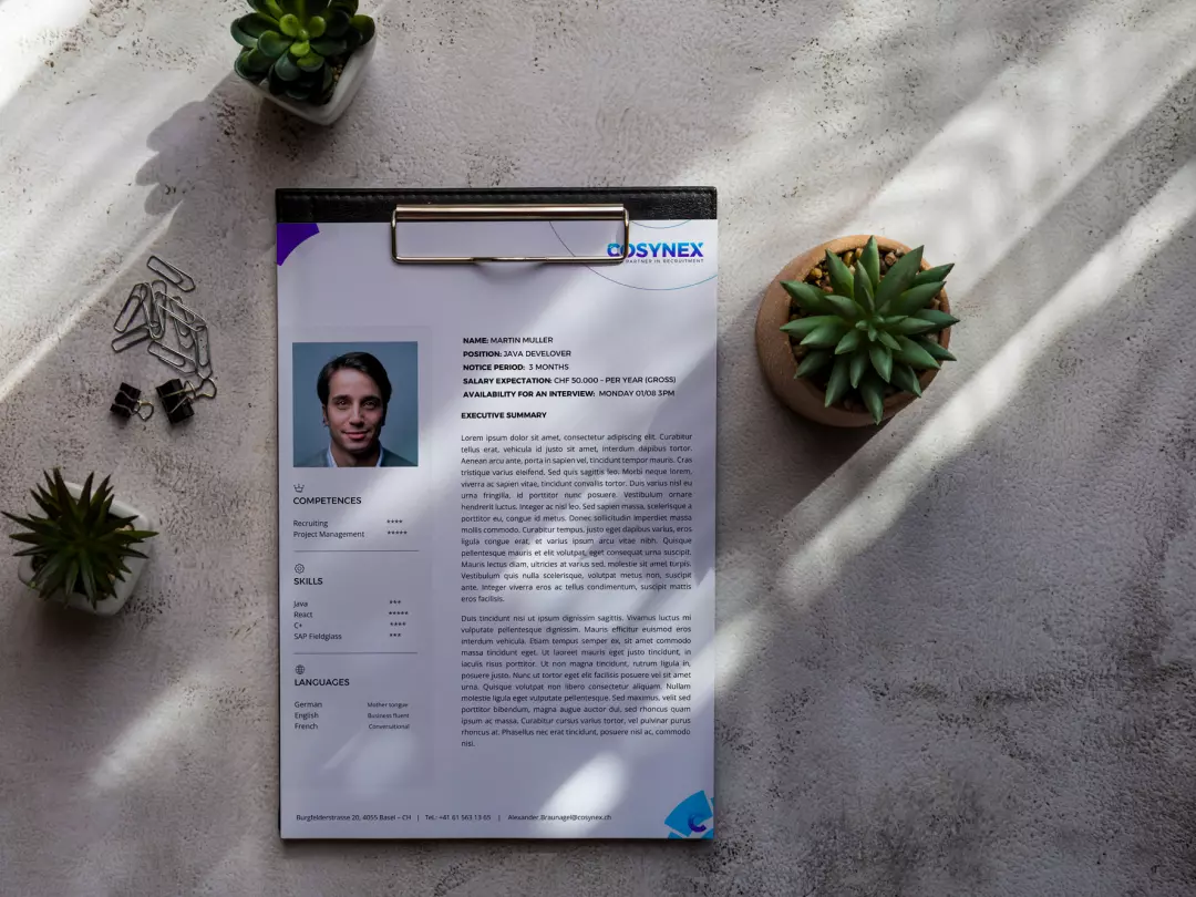 With Cosynex the challenge was to find an identity that communicated both professionalism and the idea of connection between two parties. The solution was both in the typographic construction and in the semantic reinforcement, achieving a simple, powerful and conceptual brand. This identity would then be transferred to the rest of the pieces such as business cards, CV templates, presentations, social networks and, of course, their website.