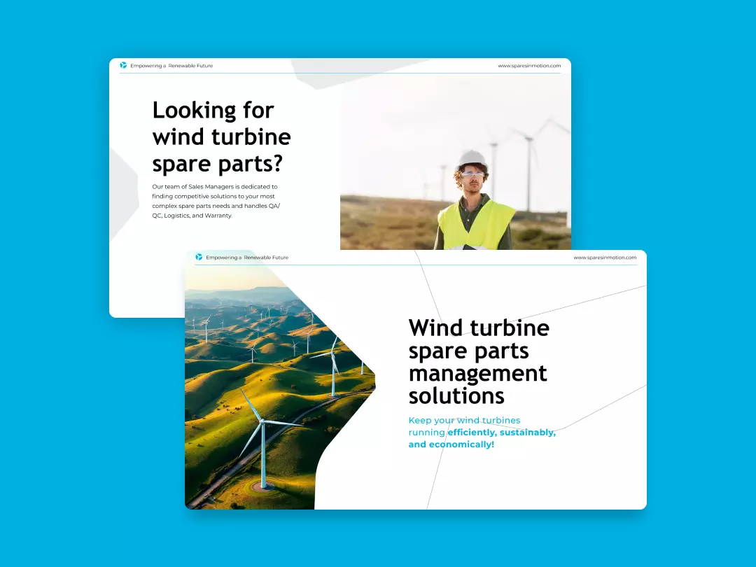 Spares in Motion is a global wind energy supplier focused on spare parts, procurement, and refurbishment. The company approached us to modernise its brand while maintaining the trust and recognition built over a decade in the sector.
